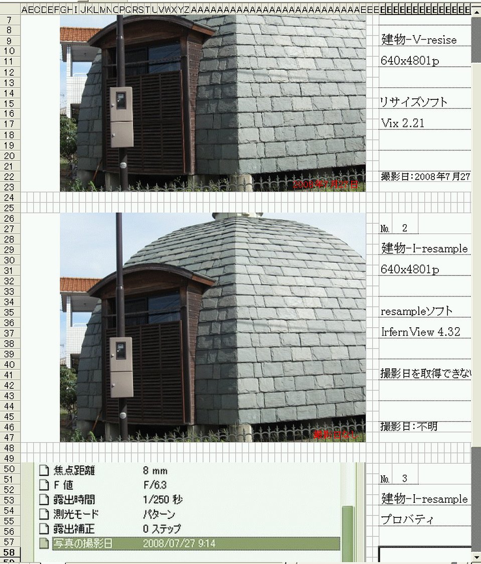 今年になってこのソフトを知ったのですが、使い勝手が改良されてるのに感激してます。ただ台帳に貼り付ける前に別ソフトで写真をリサイズしているのですが、使用ソフトによって撮影日付が不明になります。環境はXP・Excel2000(使用ソフトはVixとIrfanVew)、同サイズで設定も見直すのですが「IrfanVew」使用の物は撮影日付取得に失敗するようです。環境のせいかもしれないのでお手すきの時にでも再現するか試していただけないでしょうか?(ファイル添付します)宜しくお願いします。