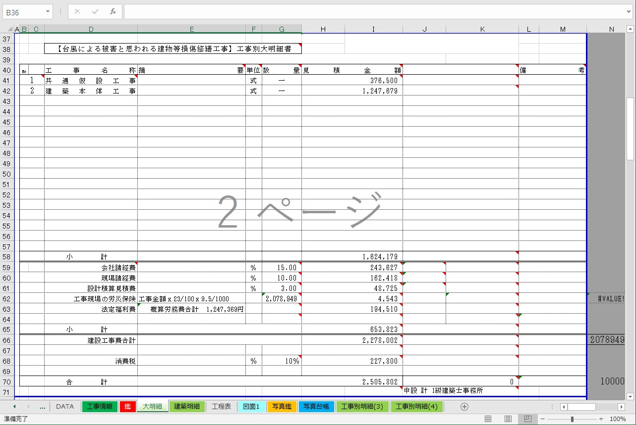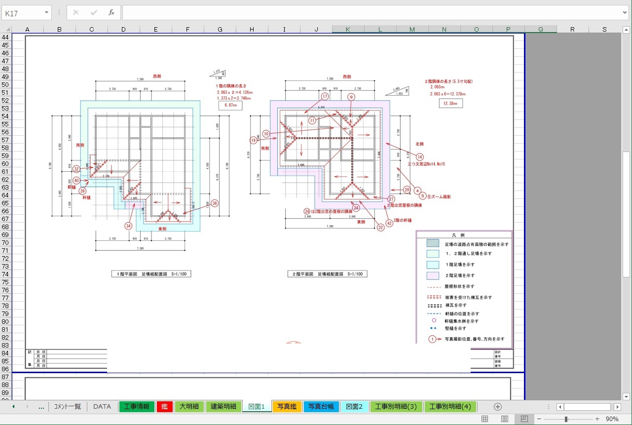 報告書には概要、表紙、見積書大明細、中明細、見積詳細、図面、工程表などシート分けして一つのファイルにして使用しています。