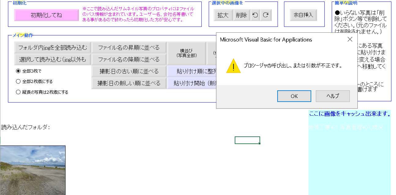 昨日まで問題無く使えてましたが、突然「無効なプロシージャの呼び出しまたは引数が不正です。」とエラーメッセージが出てきて写真仕分けが出来なくなりました。